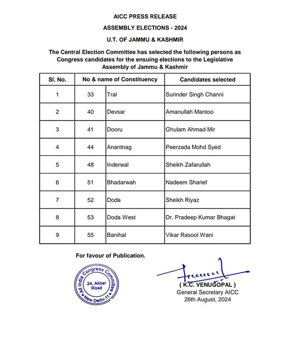 जम्मू आणि काश्मीर विधानसभा निवडणुकीसाठी काँग्रेसची नऊ उमेदवारांची यादी जाहीर