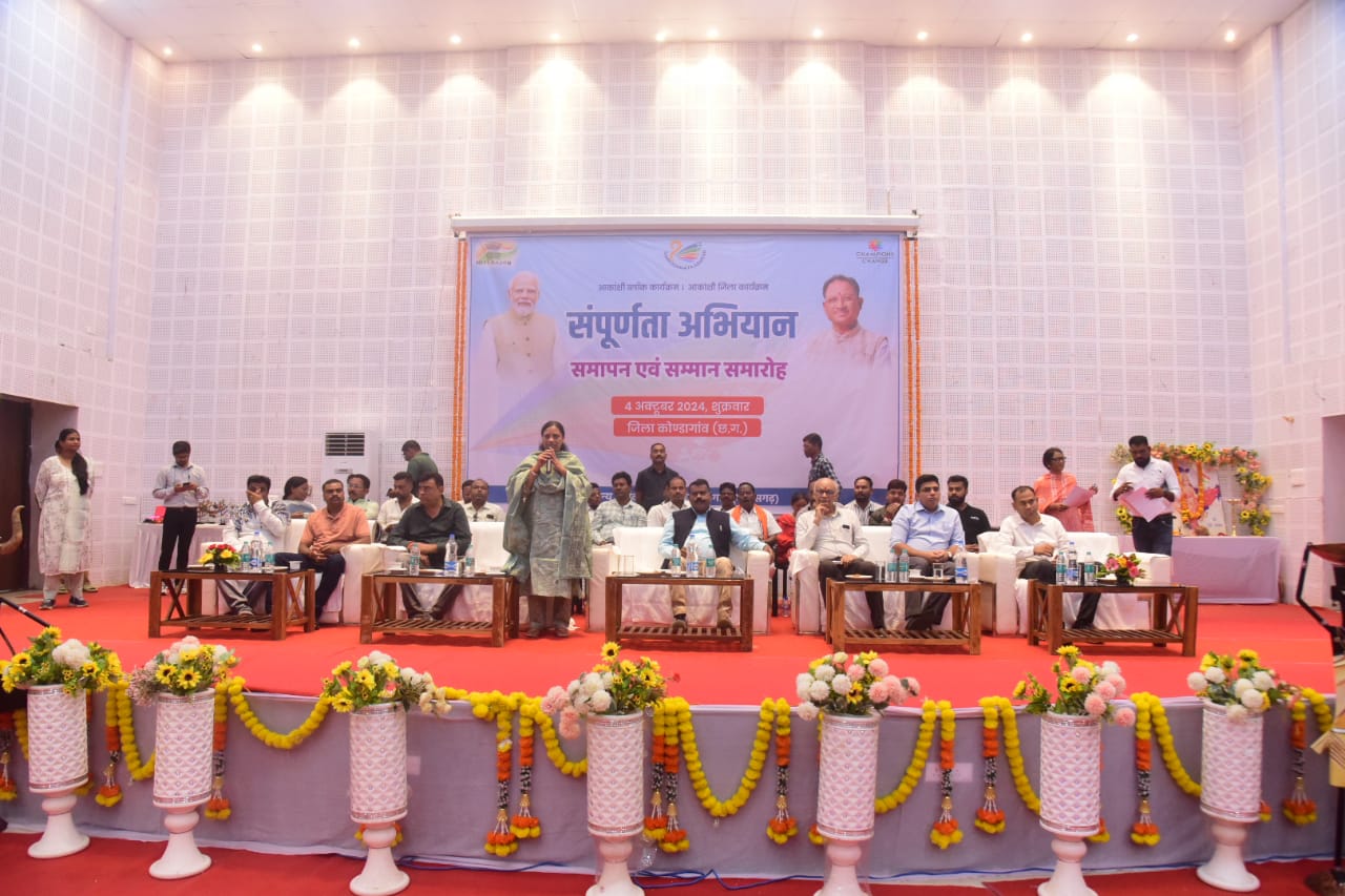 केन्द्र सरकार के नीति आयोग द्वारा आकांक्षी जिला कार्यक्रम और आकांक्षी ब्लॉक कार्यक्रम के तहत 04 जुलाई से शुरू हुए संपूर्णता अभियान का आज समापन हुआ। कोंडगांव के ऑडिटोरियम में जिला स्तरीय संपूर्णता अभियान का समापन तथा सम्मान समारोह में बस्तर विकास प्राधिकरण की उपाध्यक्ष लता उसेण्डी के मुख्य आतिथ्य और केशकाल विधायक नीलकंठ टेकाम की अध्यक्षता में संपन्न हुआ। समारोह में संपूर्णता अभियान के सभी इंडिकेटर को प्राप्त करने के लिए उत्कृष्ट कार्य करने वाले आंगनबाड़ी कार्यकर्ताओं, स्वास्थ्यर्मियों सहित बिहान, ...
