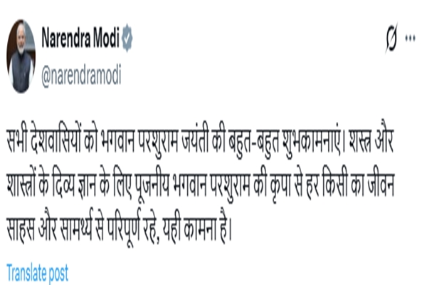 Prime Minister Narendra Modi has greeted people on the occasion of Parshuram Jayanti today. In a social media post, Mr Modi expressed his hope that the blessings of Lord Parshuram, known for his profound wisdom in weaponry and sacred texts, would fill everyone’s lives with courage and strength.